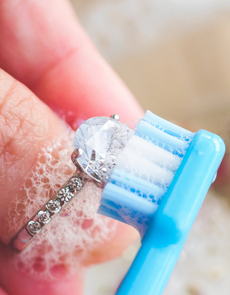 Use a soft-bristled toothbrush and mild soap in order to restore the sparkle of your stones. Gently pat dry.
