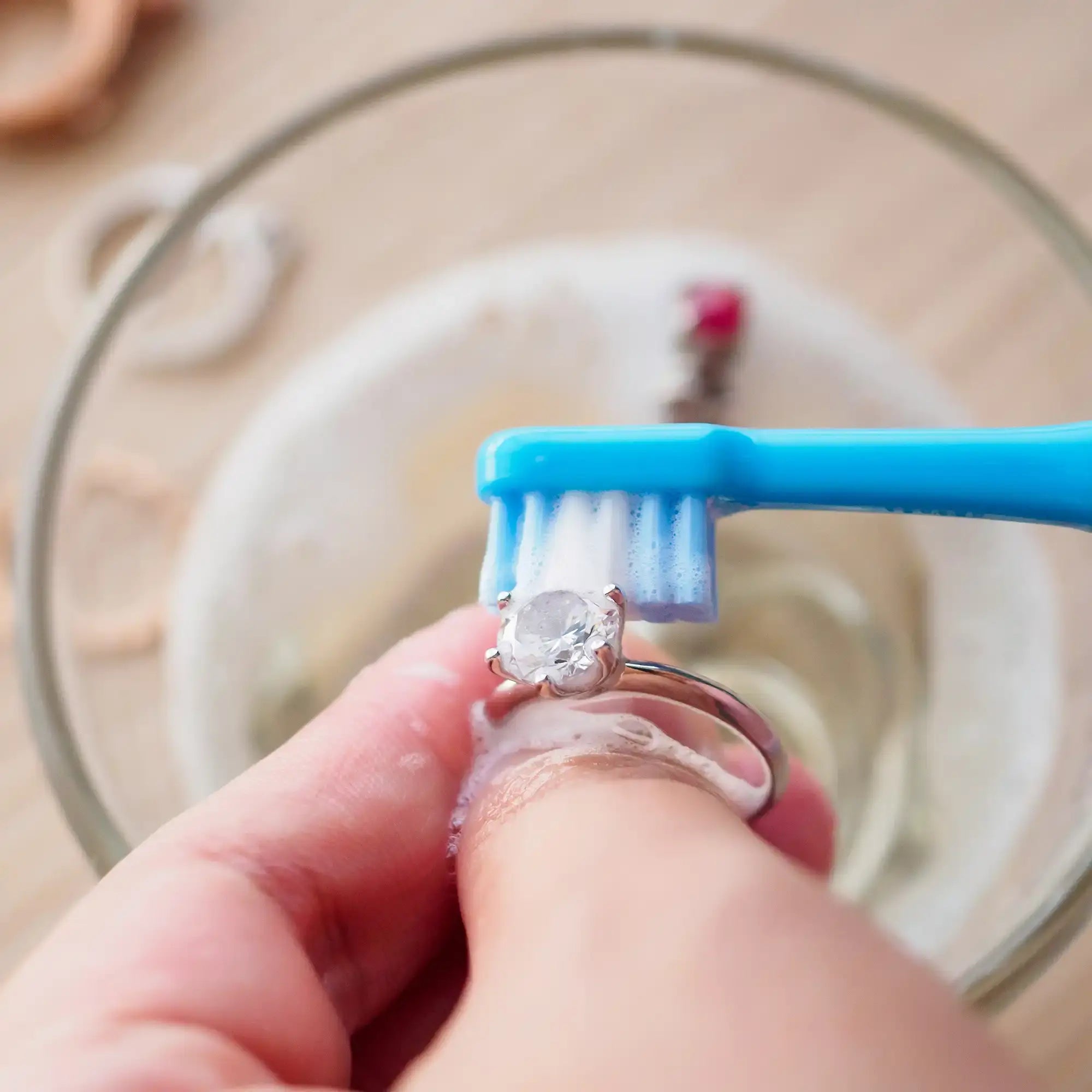 Combine this soap with warm water and employ a soft toothbrush to clean. Allow your ring to soak for approximately 10-20 minutes, depending upon necessity, and subsequently scrub it gently under warm flowing water with the toothbrush. Pay particular attention to the underside of the diamond, where residues are more likely to accumulate.